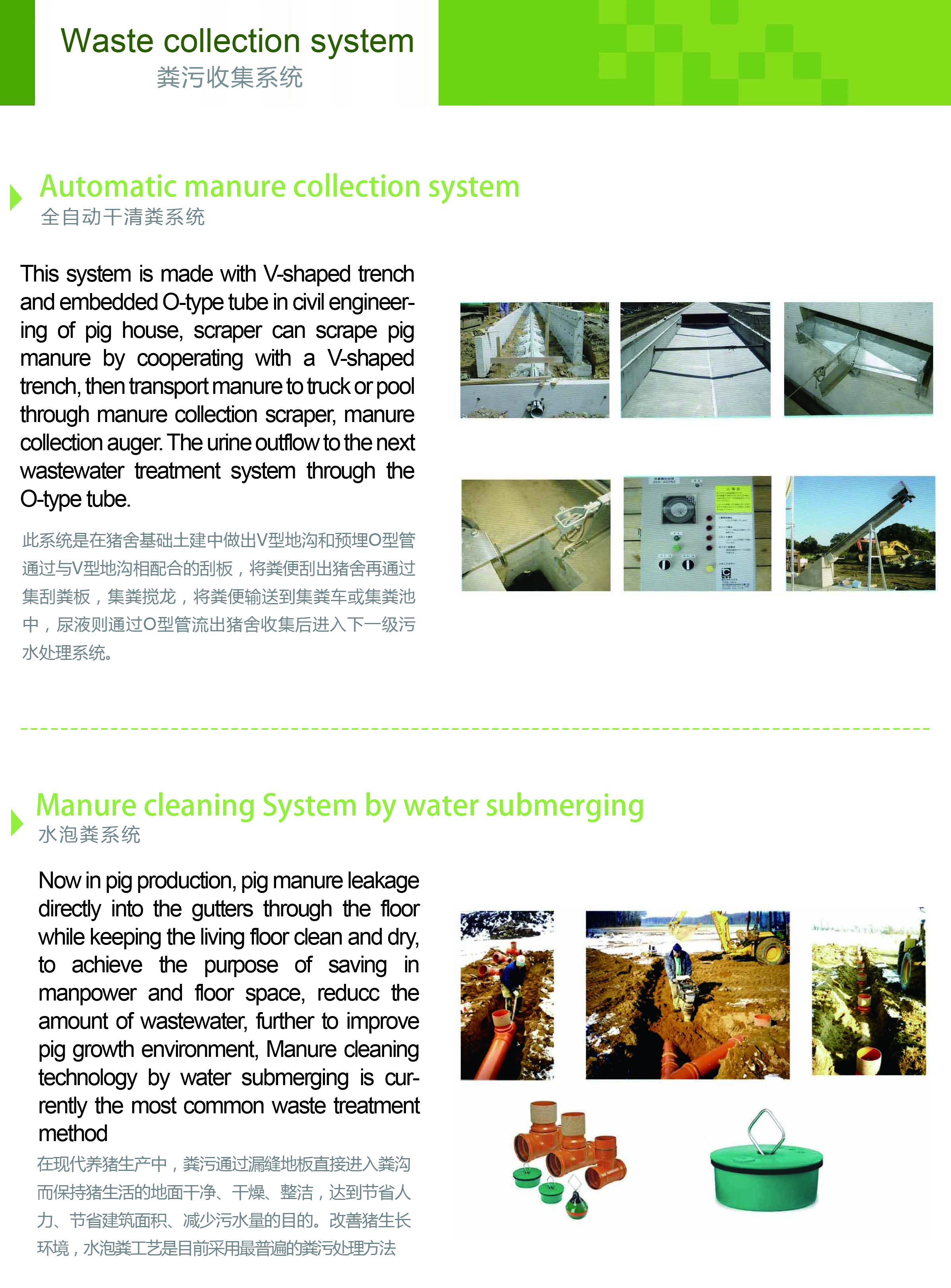 此系統是在豬舍基礎土建中做出V型地溝和預埋O型管通過與V型地溝相配合的刮板,將糞便刮出豬舍再通過集刮糞板,集糞攪龍,將糞便輸送到集糞車或集糞池中,尿液則通過O型管流出豬舍收集后進入下一級污水處理系統。